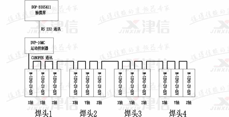 本方案針對(duì)多焊點(diǎn)塑料焊接設(shè)計(jì)。整套設(shè)備都由10MC控制,每個(gè)焊頭由3套A2伺服驅(qū)動(dòng)器組合完成,實(shí)現(xiàn)空間上的X-Y-Z 3軸動(dòng)作。,可以單焊頭或多焊頭組合,并且按照配方所規(guī)劃的路徑運(yùn)動(dòng)。