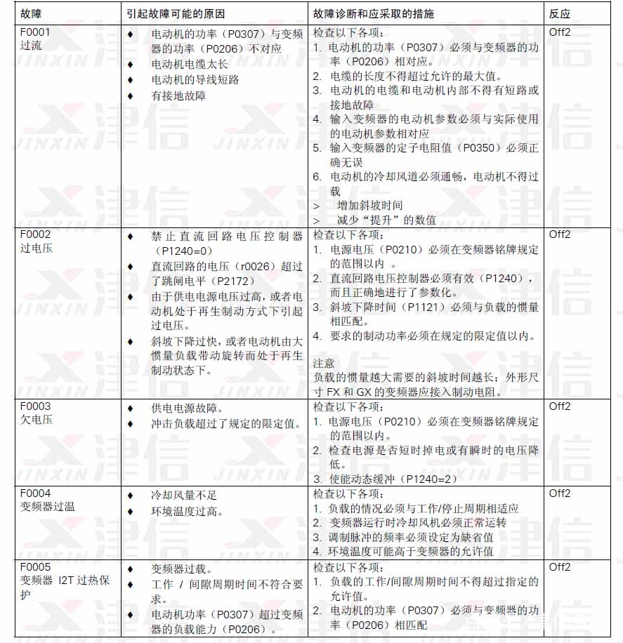 故障信息以故障碼序號的形式存放在參數R0947 中(例如,F0003=3)。相關的故障值可以在參數R0949 中查到,如果該故障沒有相關的故障值,R0949 中將輸入0。而且,可以讀出故障發生的時間(R0948)和存放在參數R0947 中的故障信息序號(P0952)。